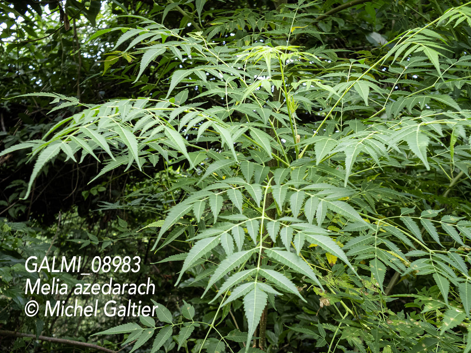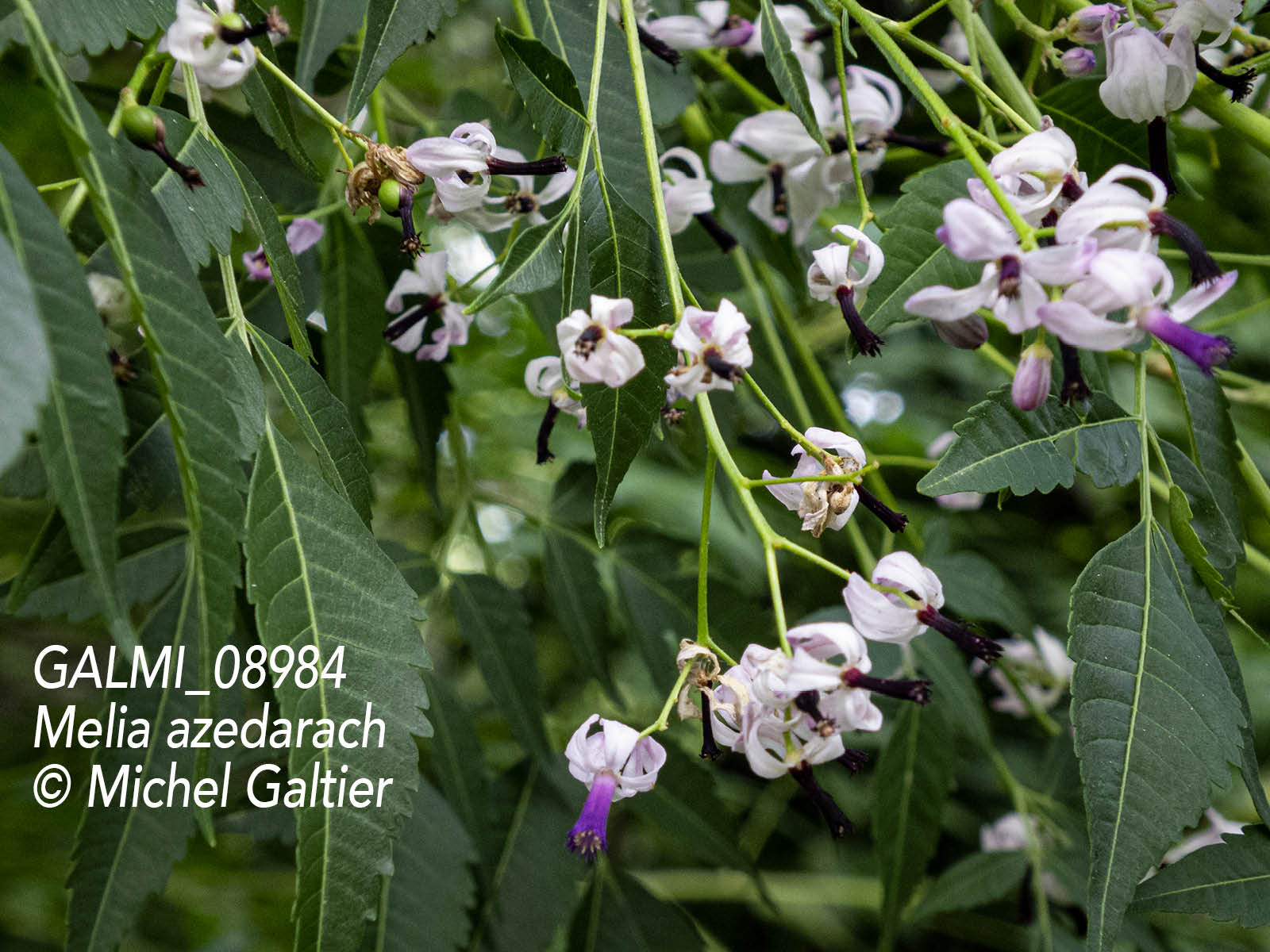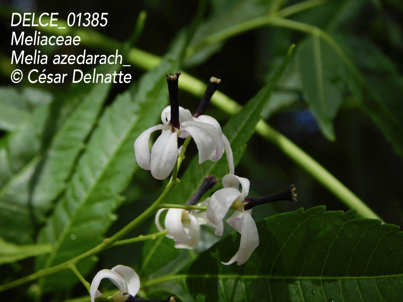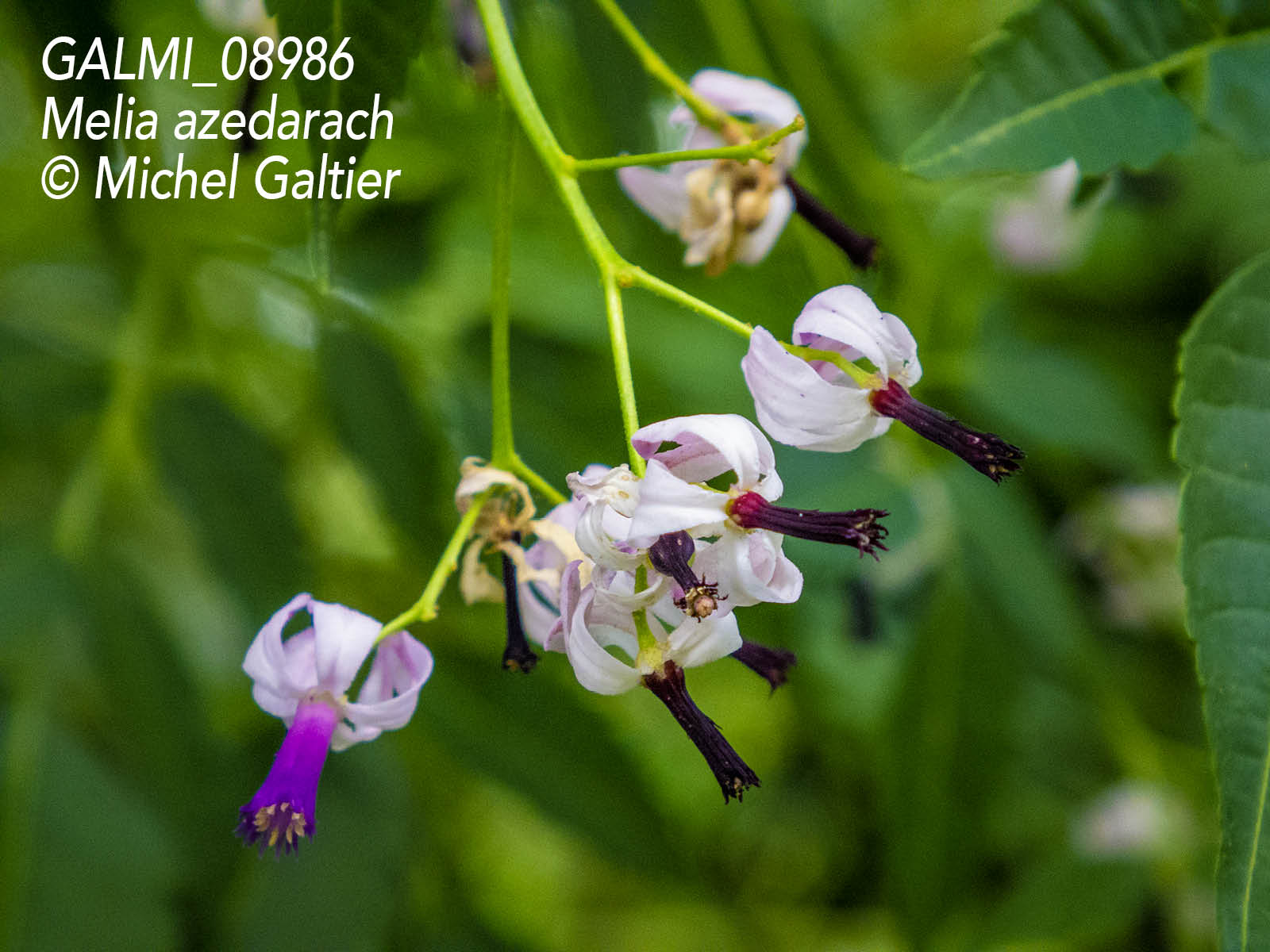Arbuste ou petit arbre, H 3-6 (-15) m, très élégant à l’état jeune. Branches fastigiées, puis horizontales ou inclinées, peu feuillues. Rameaux à poils stellés. Feuilles L 20-80 cm ; pennes opposées, 2-5 paires, avec une penne terminale. Folioles 2-3 paires/penne, ovées-lancéolées, glabres, fines, vert clair, L 2-8 cm x l 7-30 mm ; base aigüe ou arrondie, un peu inégale ; apex aigu à longuement acuminé ; marge serretée, incisée ou lobée ; pétiolules courts ou subnuls. Panicules terminales ou subterminales, L 8-25 cm ; fleurs à forte odeur de lilas. Sépales finement pubescent, lancéolés à elliptiques, L 1,5 -3 mm. Pétales violacés, bleuâtres ou blancs, oblanc. à spatulés, L 8-12 mm, étalés. Tube staminal étroit, pourpre ou violet foncé, L 6-7 mm, portant 10 anthères. Ovaire glabre. Drupe jaune à maturité, subglobuleuse, lisse, diamètre 13-18 mm, vénéneuse. Endocarpe osseux, sillonné.