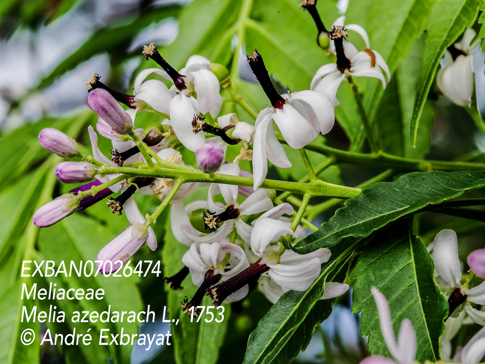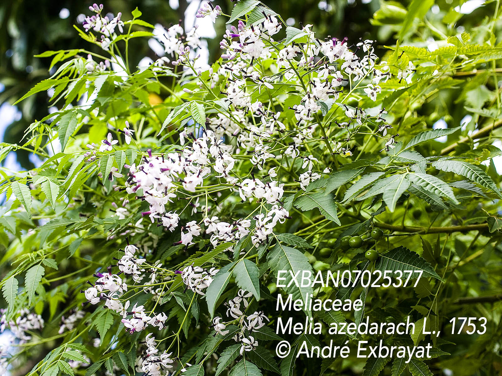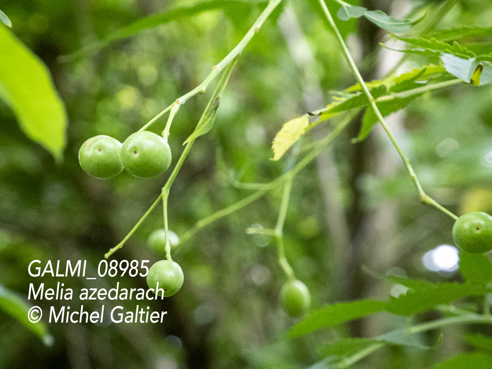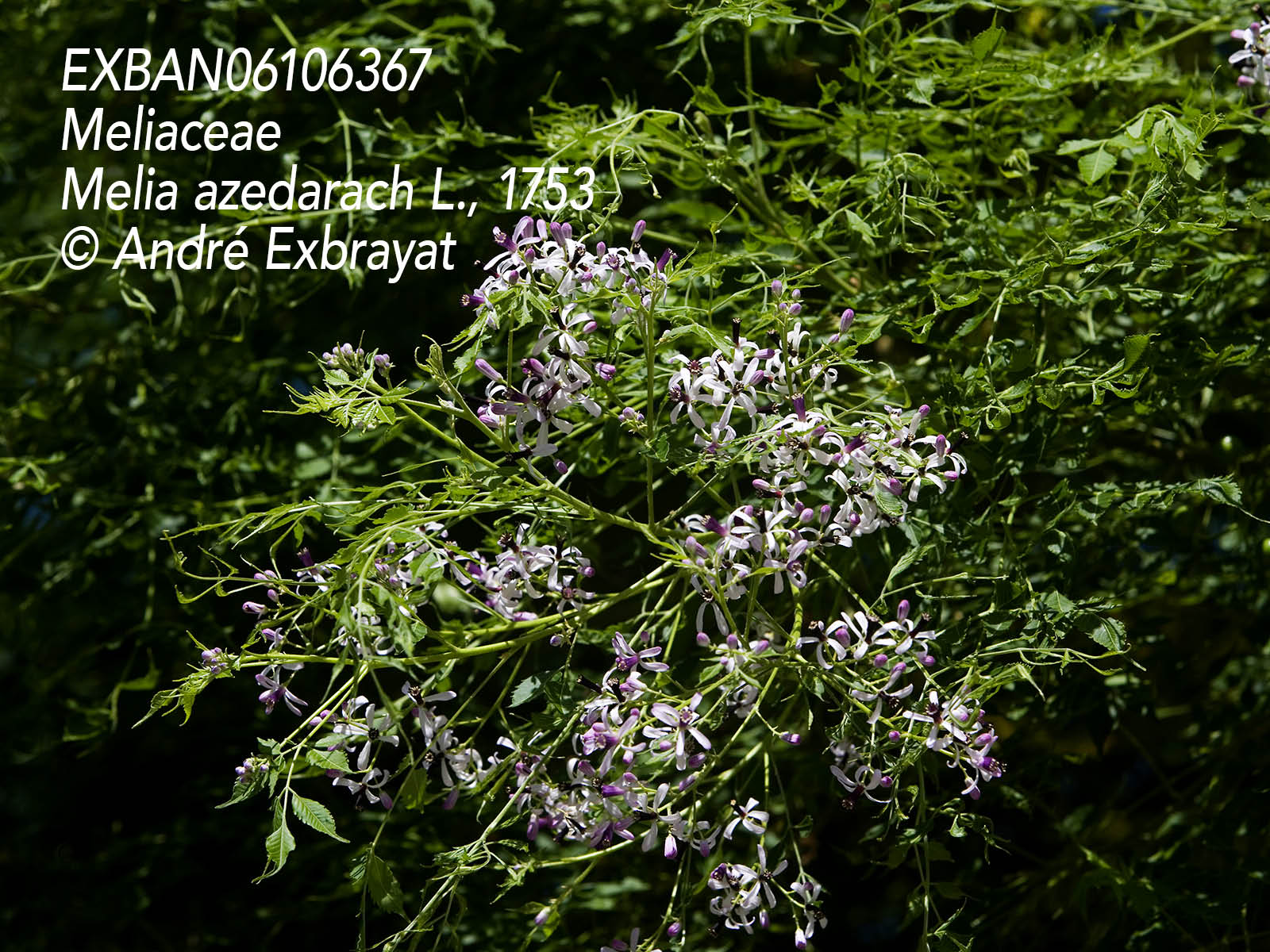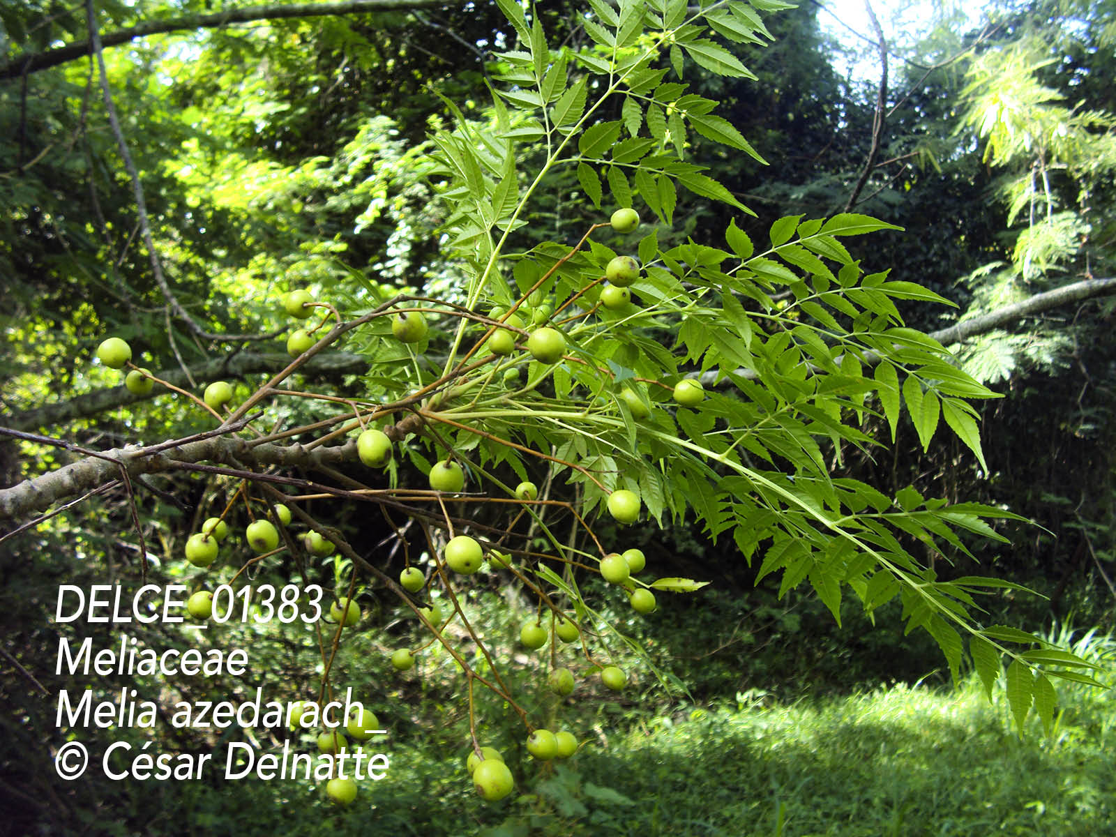 Arbuste ou petit arbre, H 3-6 (-15) m, très élégant à l’état jeune. Branches fastigiées, puis horizontales ou inclinées, peu feuillues. Rameaux à poils stellés. Feuilles L 20-80 cm ; pennes opposées, 2-5 paires, avec une penne terminale. Folioles 2-3 paires/penne, ovées-lancéolées, glabres, fines, vert clair, L 2-8 cm x l 7-30 mm ; base aigüe ou arrondie, un peu inégale ; apex aigu à longuement acuminé ; marge serretée, incisée ou lobée ; pétiolules courts ou subnuls. Panicules terminales ou subterminales, L 8-25 cm ; fleurs à forte odeur de lilas. Sépales finement pubescent, lancéolés à elliptiques, L 1,5 -3 mm. Pétales violacés, bleuâtres ou blancs, oblanc. à spatulés, L 8-12 mm, étalés. Tube staminal étroit, pourpre ou violet foncé, L 6-7 mm, portant 10 anthères. Ovaire glabre. Drupe jaune à maturité, subglobuleuse, lisse, diamètre 13-18 mm, vénéneuse. Endocarpe osseux, sillonné.